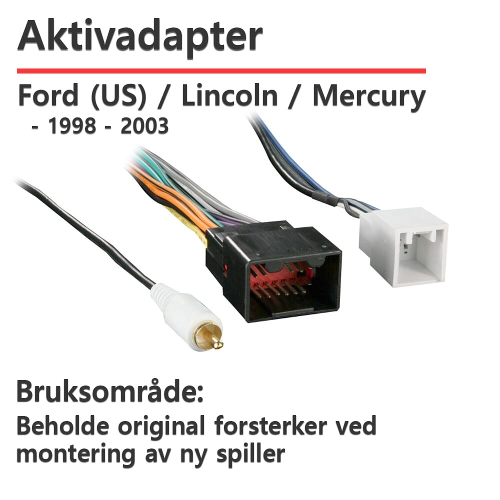 Adapter for å beholde original forsterker ved bytte til ettermarkedsspiller.KompatibilitetLincoln Town Car 1998 - 2002Mercury Grand Marquis 1998 - 2002Ford Escape 2001 - 2003
