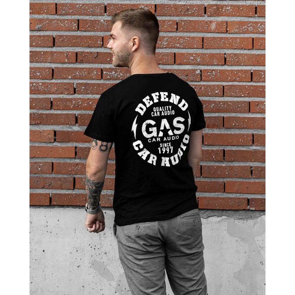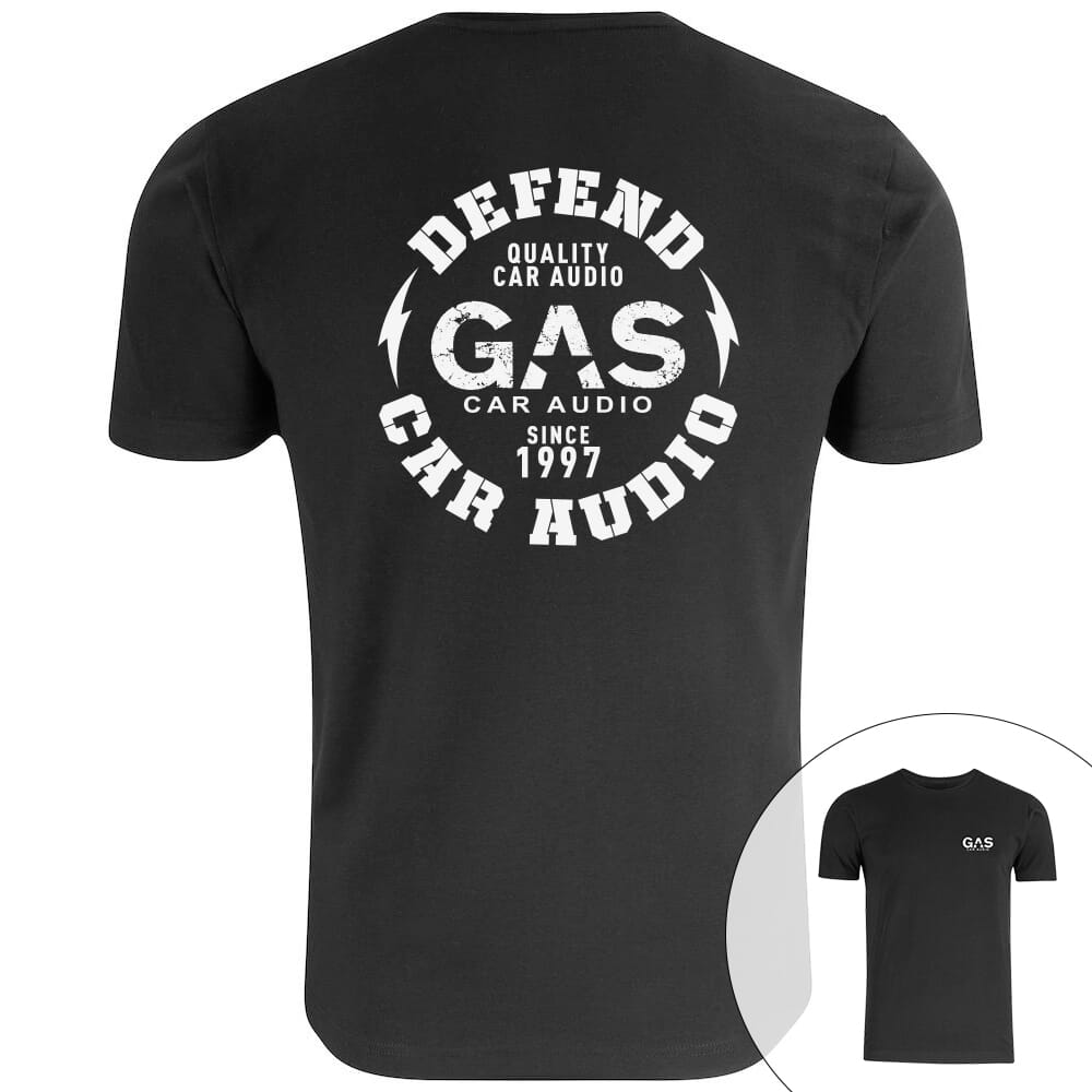 Stor "Defend Car Audio"-trykk på ryggen, og liten diskret GAS-logo på brystet.