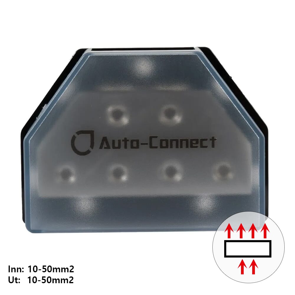 Fordelingsblokk av høy kvalitet som kan benyttes med alt fra 10mm2 til 50mm2 kabler takket være innsatshylser. Hylsene beholdes i fordelingsblokken dersom man skal bruke 10mm2 eller 20mm2 kabler , og tas ut ved bruk av 35mm2 eller 50mm2.