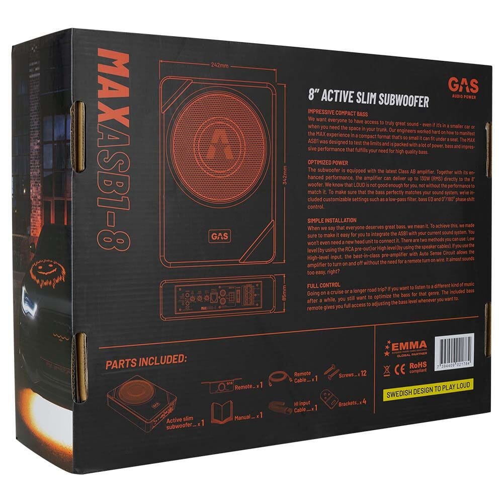 GAS MAX ASB1-8 er en smidig og kompakt aktiv basskasse med et velspillende 8" basselement og innebygget forsterker på 130W RMS. Denne kassen er imponerende lettplassert og kan fordelaktig plasseres i biler der det ikke er plass til en større kasse, eller man ønsker en mest mulig diskret bassløsning i bilen.