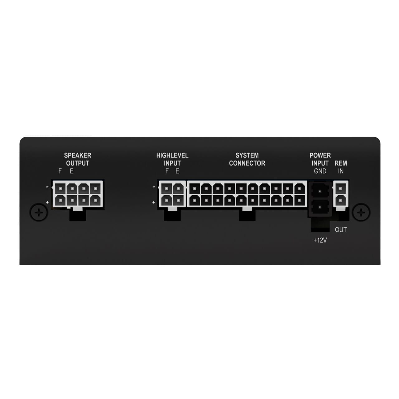 På utgangssiden tilbyr den seks forsterkerkanaler, supplert med en linjeutgang og den integrerte 7-kanals DSP-en for fleksible høyttalerkonfigurasjoner og presis lydjustering. Når det gjelder kraft, leverer forsterkeren 4 x 65 Watt RMS i 4 ohm, samt to kraftige subwooferutganger med opptil 2 x 90 / 160 Watt RMS i henholdsvis 4 / 2 ohm maksimal utgangseffekt. Ideelt for et kraftfullt frontsystem og solid kontroll på subwooferen.