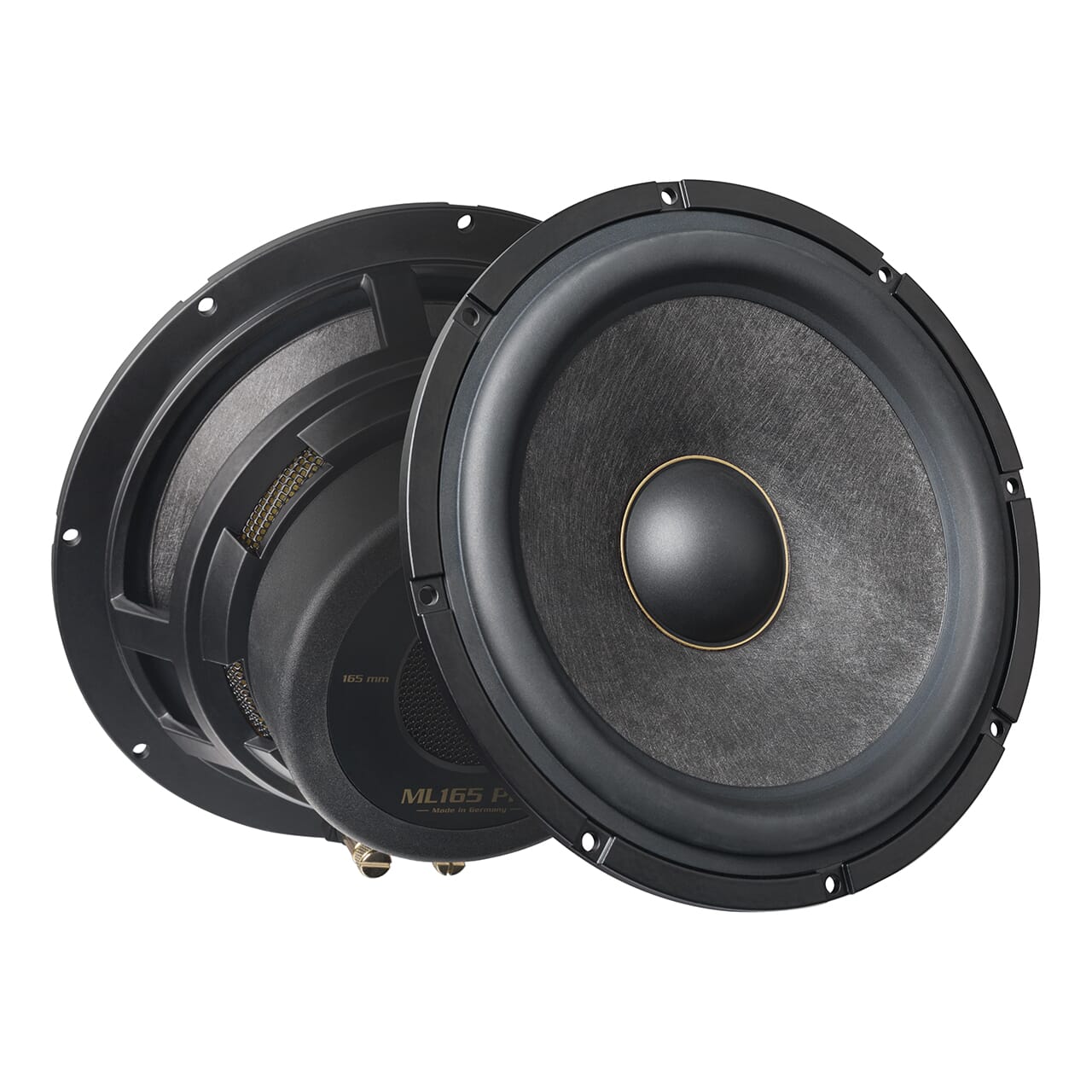 Med sitt raffinerte design formidler ML165 PRO et visuelt inntrykk som perfekt utfyller dens fremragende akustiske ytelse. Den fine, silkematte overflaten på membraneen, den matt svarte pulverlakkerte aluminiumskurven og den gylne aksentringen rundt støvhetten gir den en distinkt, elegant karakter, perfekt egnet for sømløs integrering i ethvert kjøretøyinteriør.