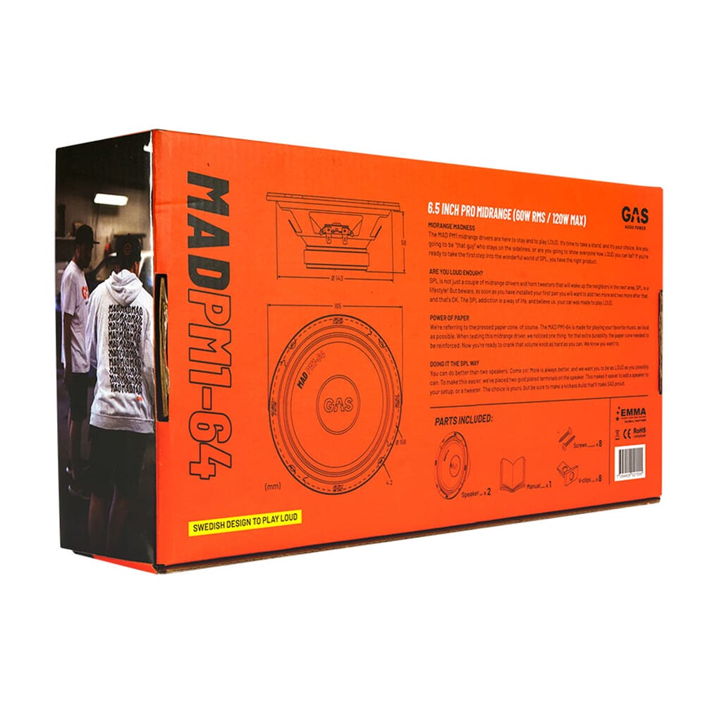 Den suksessrike høyttaleren PSM6 har endelig fått en verdig erstatter; med MAD PM1-64 fortsetter GAS å tilby vannvittig mye lyd per krone. Midbassen er designet for deg som ikke er redd for å skru opp volumet når anledningen byr seg. Konen er laget av forsterket presset papir, og kurven er laget av stål. Holdbart, rett og slett.