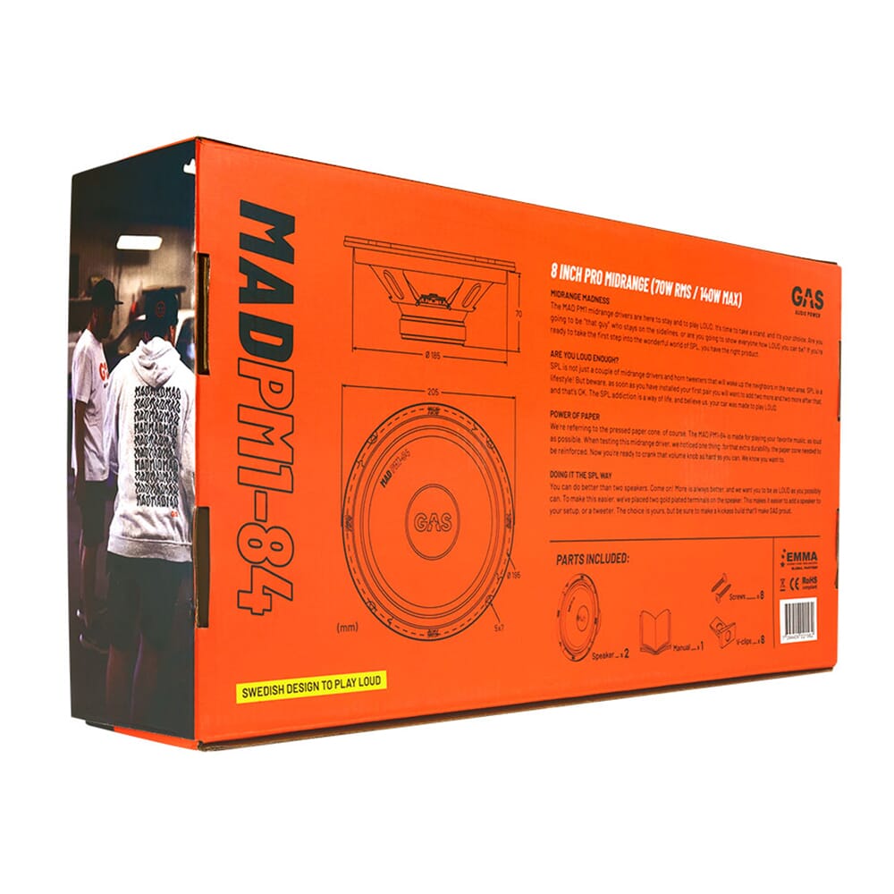 Den suksessrike høyttaleren PSM8 har endelig fått en verdig erstatter; med MAD PM1-84 fortsetter GAS å tilby vannvittig mye lyd per krone. Midbassen er designet for deg som ikke er redd for å skru opp volumet når anledningen byr seg. Konen er laget av forsterket presset papir, og kurven er laget av stål. Holdbart, rett og slett.