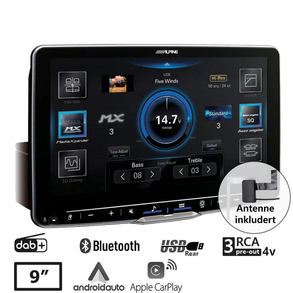 Alpine Halo9 er også Hi-Res Audio sertifisert, og kan dekode og avspille musikkfiler med høy oppløsning. Et bredt utvalg muligheter for underholdning DAB+ mottaker er selvsagt standard i tillegg til FM-radio. Utover dette har Alpine utvidet mulighetene rundt avspilling av USB-video (MP4, MOV, FLV, MKV) samtidig gir en dedikert HDMI-inngang mulighet for tilkobling av ekstern avspillingsenhet. Halo9 2gen. er selvsagt kompatibel med Android Auto via kablet tilkobling.