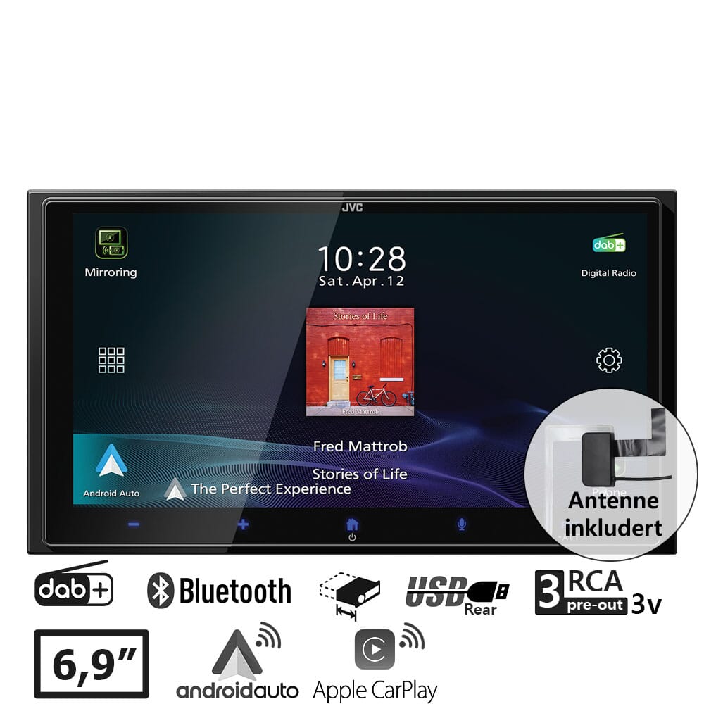 JVC KW-M795DBW er en moderne 2-DIN Digital Media Receiver med høyoppløst 6,92" HD-skjerm (1280 x 720), innebygd DAB+ tuner og både trådløs og kablet Apple CarPlay og Android Auto. En komplett løsning for deg som ønsker sømløs smarttelefonintegrasjon, HD-bilde og avansert lydjustering i bilen. Med en short body på kun 75 mm, er denne hovedenheten enkel å installere i de fleste biler. Med støtte for ryggekamera, tre RCA-linjeutganger og en rekke andre funksjoner, gir JVC KW-M795DBW deg en førsteklasses lyd- og bildeopplevelse i bilen din.