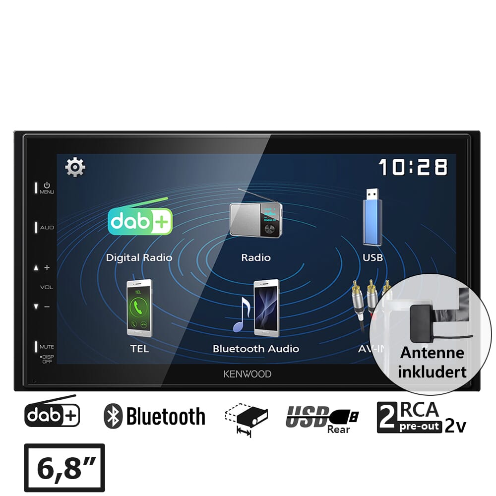 Kenwood DMX129DAB har en praktisk og brukervennlig kapasitiv touchskjerm som gir et høyt kontrastforhold, krystallklar skjerm og tydelig tekst.Spilleren støtter Android USB mirroring som gir deg muligheten for å vise og kontrollere din Android smarttelefon på spillerens skjerm.Du kan nyte dine favorittapper på det store displayet, med imponerende lydkvalitet.DAB+ radiomottakeren sikrer støyfritt mottak og krystallklar stereolyd.DMX129DAB støtter i tillegg flere typer video- og musikkformater.DAB+ vindusantenne er inkludert i prisenViktigste funksjoner: