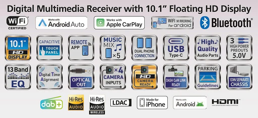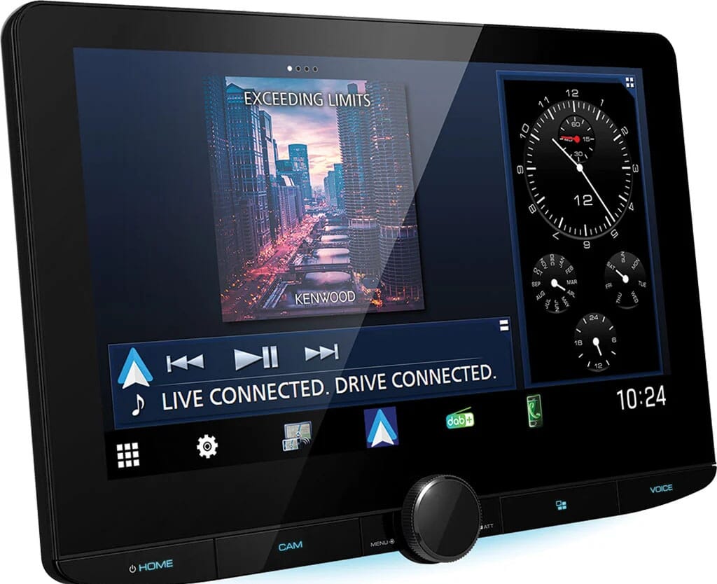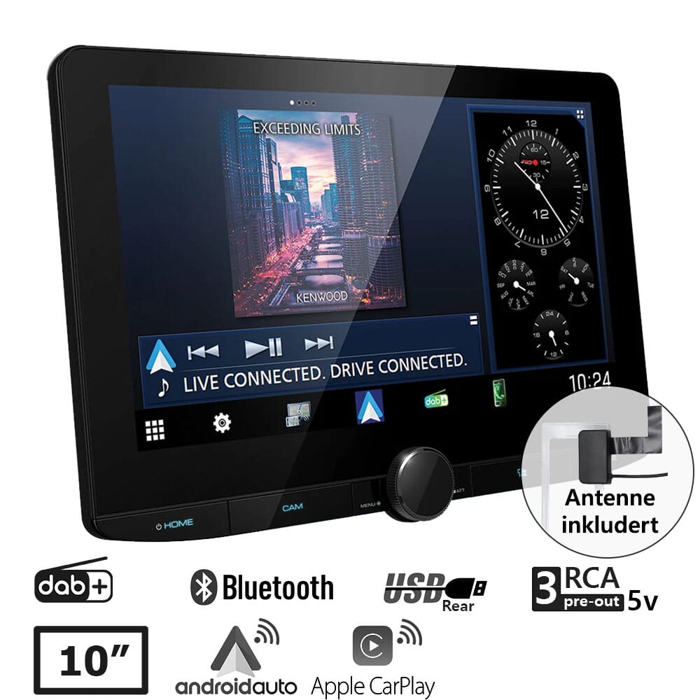 Kenwood 10,1" flytende skjerm, 2-DIN Multimedia - DAB-radio (CD-løs/mecha-less). Kompatibel med TRÅDLØS Apple CarPlay og Android Auto, WIFi, Bluetooth, Spotify-støtte mm. Dette er en Multimediaspiller med 10,1" flytende skjerm og støtte for mange forskjellige lyd- og videofilformater. Spilleren har en 13-bånds Equaliser og digital lydprosessor med tidskorrigering.