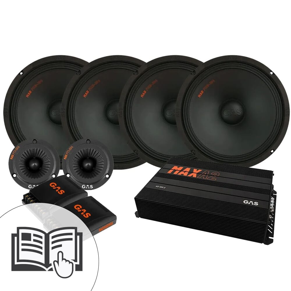 4-pakning med fete og velspillende midbasser fra GAS, kombinert med 2 stk horndiskanter og 2-kanals forsterker fra GAS MAX-serien, samt 2 delefiltre.