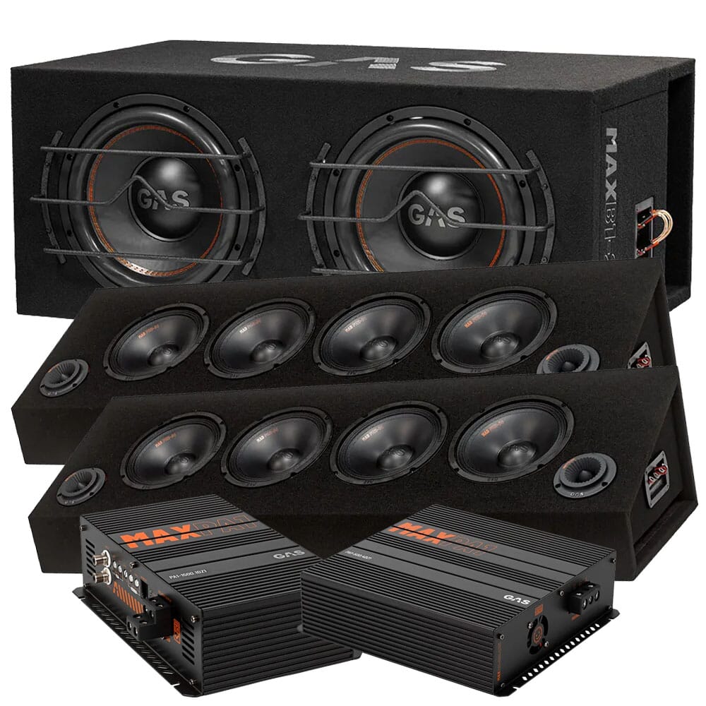 Komplett raggarpakke med GAS sin formidable MAX B1 2x12" basskasse, 2 stk tøffe 8" SPL Raggarplanker og tilhørende forsterkere - også fra MAX-serien selvsagt.