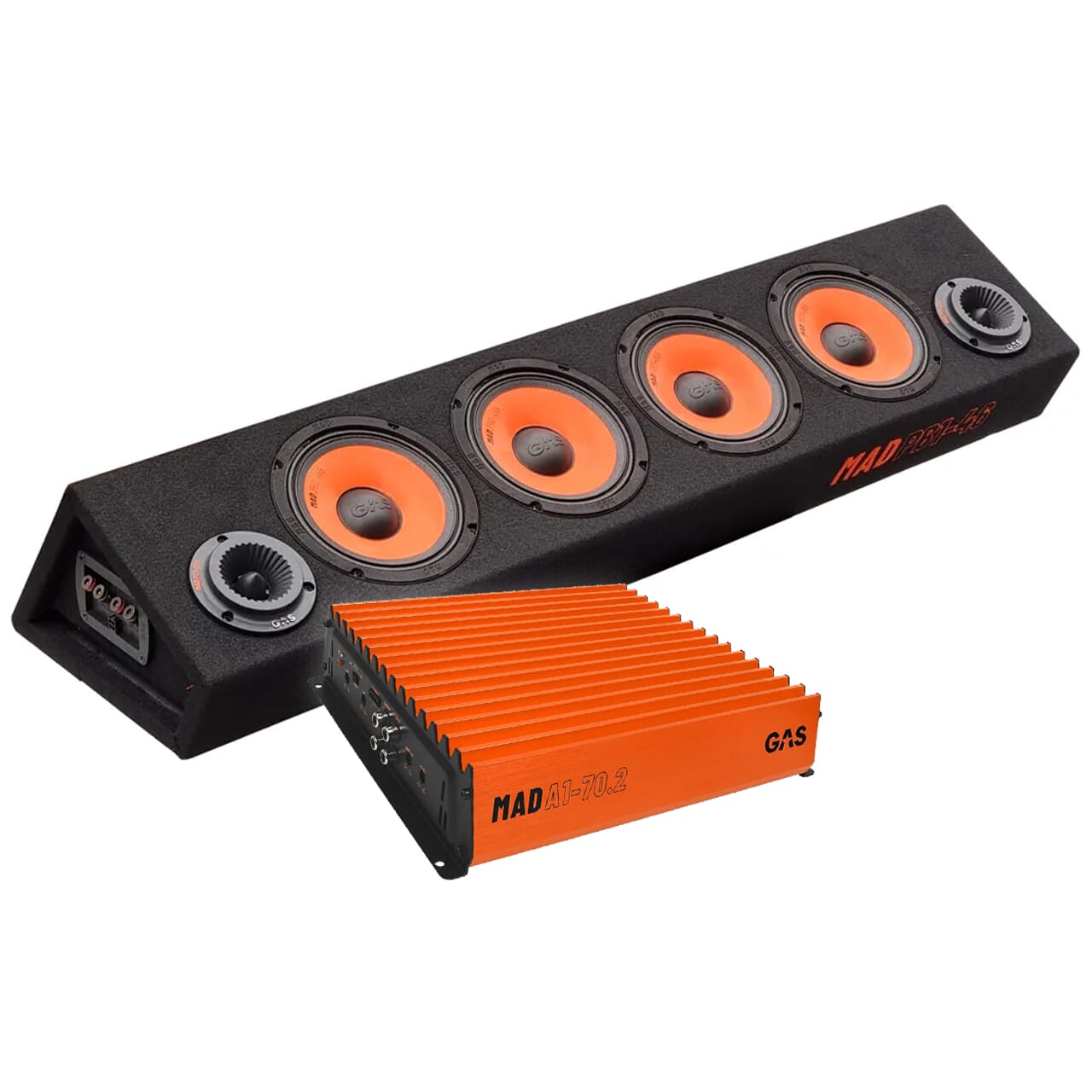 Knalltøff Raggarpakke som virkelig drar på! Raggarplanken MAD PB1-46 fra GAS bestående av 4 stk 6,5" SPL midbasser og 2 horndiskanter er her kombinert med forsterkeren MAD A1-70.2 - også fra GAS. Et knallbra kjøp som gir garantert mye lyd!