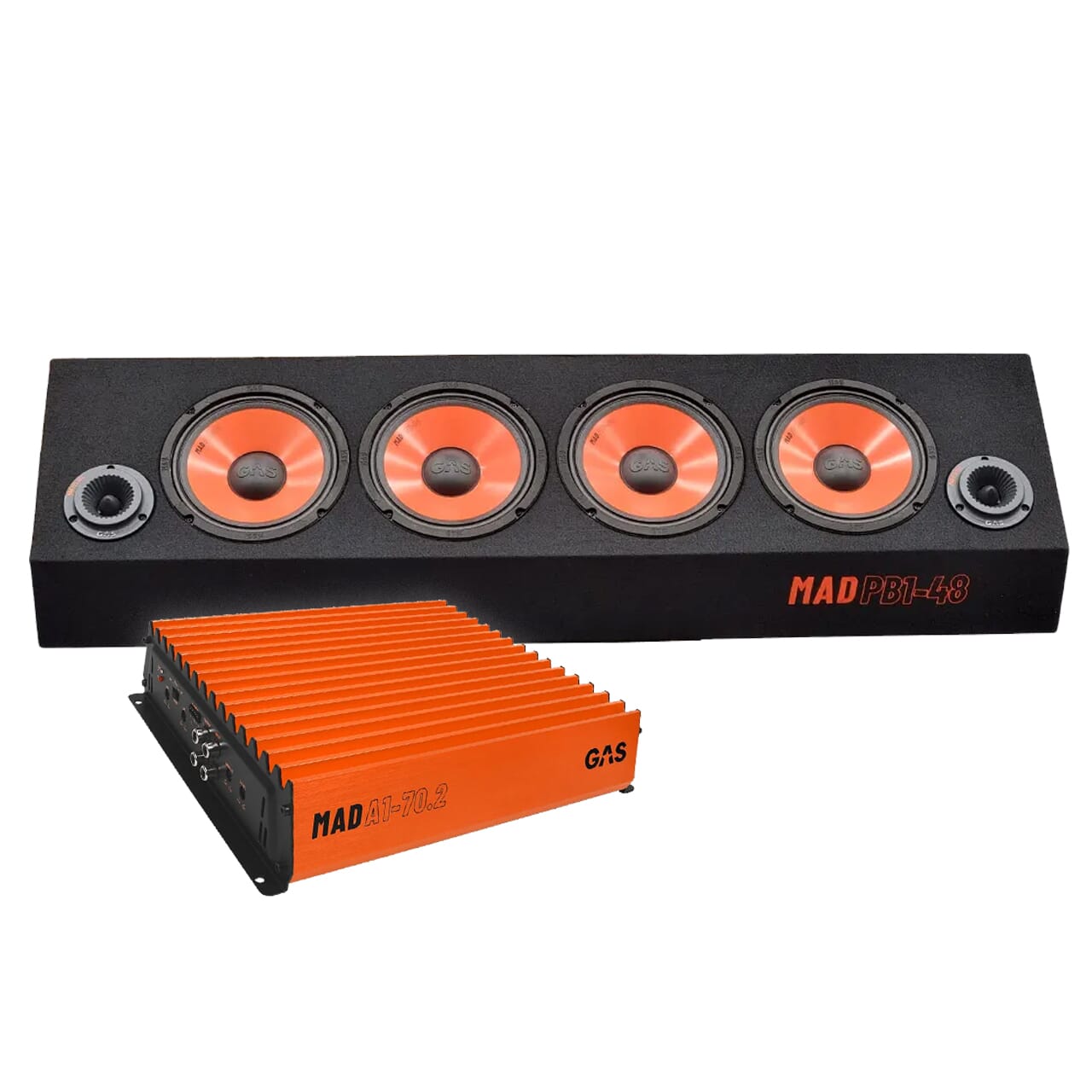 Knalltøff Raggarpakke som virkelig drar på! Raggarplanken MAD PB1-48 fra GAS bestående av 4 stk 8" SPL midbasser og 2 horndiskanter er her kombinert med forsterkeren MAD A1-70.2 - også fra GAS. Rett og slett et knallbra kjøp som garantert gir mye lyd!