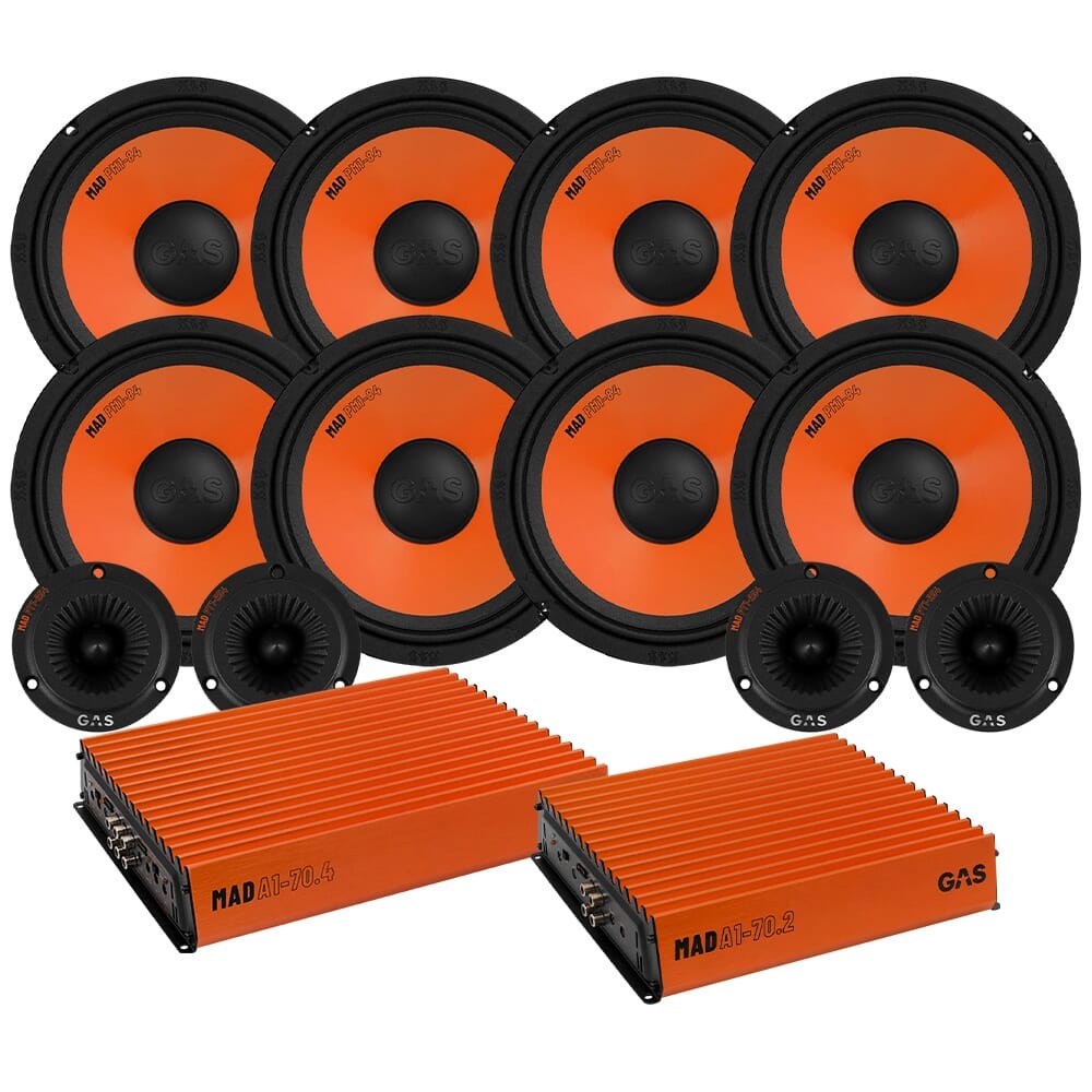 Pakken inneholder hele 8 stk 8" midbasser, 4 stk horndiskanter og 2 forsterkere fra GAS.