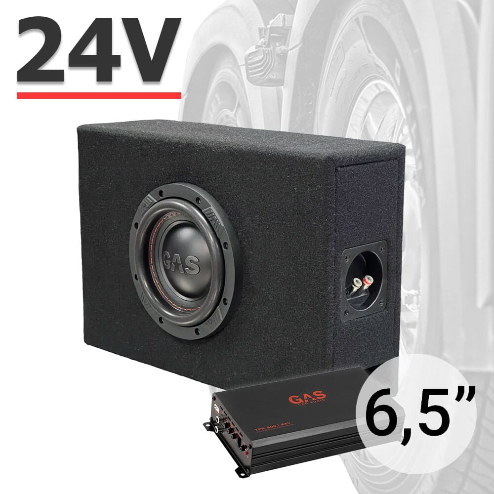 Basspakke for 24V kjøretøyer. Denne pakken inneholder en meget kompakt 6,5" subwoofer plassert i en genial kasse som kan monteres stående eller liggende. Basskassen drives av GAS TFP 24V monoforsterker som yter inntil 500W RMS i 2 Ohm. Siden forsterkeren er dedikert 24V slipper man ustabile og fordyrende omformere. Perfekt for å fylle lastebilen med god bass. Basskasse - GAS MAX B1-16D1Denne kassen imponerer gang på gang og kan beskrives som definisjonen av "ulv i fåreklær". Glem alle små aktive basskasser som historisk sett har vært eneste alternativ i kjøretøy med begrenset plass. Dette er i en liga for seg selv. Selv bassglad ungdom drar på smilebåndet når man får denne pakken montert i kjøretøyet sitt. Samtidig skal man ikke være redd for at bassmengde har gått på bekostning av musikalitet. Rett og slett vellåtende til alle musikksjangre.