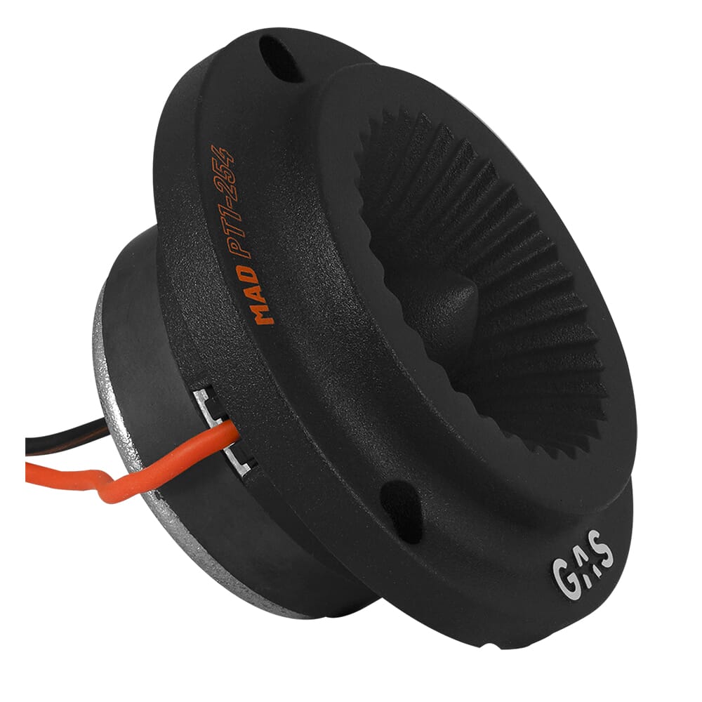 GAS MAD PT1-254 er et par spilleglade 1" horndiskanter som leverer voldsomt stor lyd! Diskantene er utrustet med en solid 1" talespole, grov magnet og lettdreven konstruksjon, samtidig som den nyutviklede og bølgeformede spredningslinsen tar lyden til uante høyder.