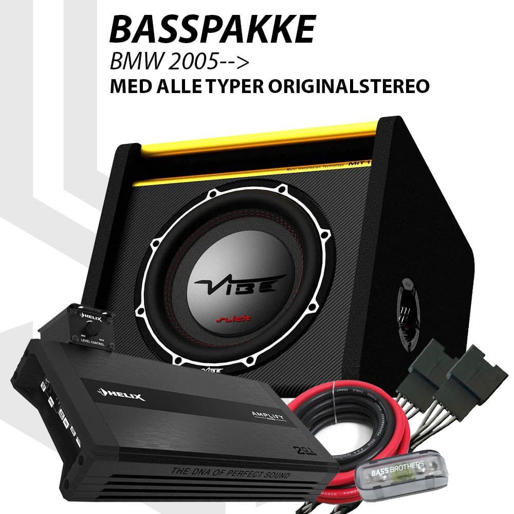 Det behøver ikke være vanskelig å ettermontere en basspakke selv i BMW av nyere dato. Selv ikke kraftig 12" basspakke. Denne pakken bygger på HELIX AMPLIFY 201 X-OVER, en bassforsterker av ypperste kvalitet. Det geniale med akkurat denne modellen er at den innehar en høynivåinngang kompatibelt mot vårt egetproduserte BMW høynivåkabelsett. Ikke bare det, men høynivåinngangen er dimensjonert så kraftig at den tåler spenningsnivået i et hvert fabrikkoriginalt lydsystem.
