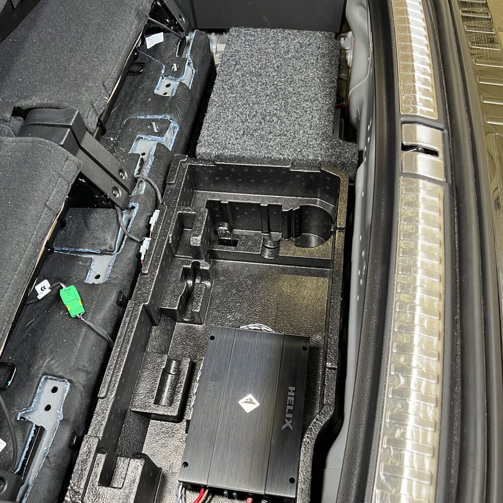 For å drive denne subwooferen har vi valgt ut en kompakt og kraftig monoforsterker; Helix M ONE. Dette er en av våre mest brukte - og mest solgte - forsterkere, og det er ikke uten grunn. Bunnsolid kvalitet, kompakte mål og god effekt er denne forsterkerens kjennetegn. Helix M ONE yter 410W RMS i dette oppsettet og er så liten at den lett plasseres skjult i bagasjeromsbrønnen.