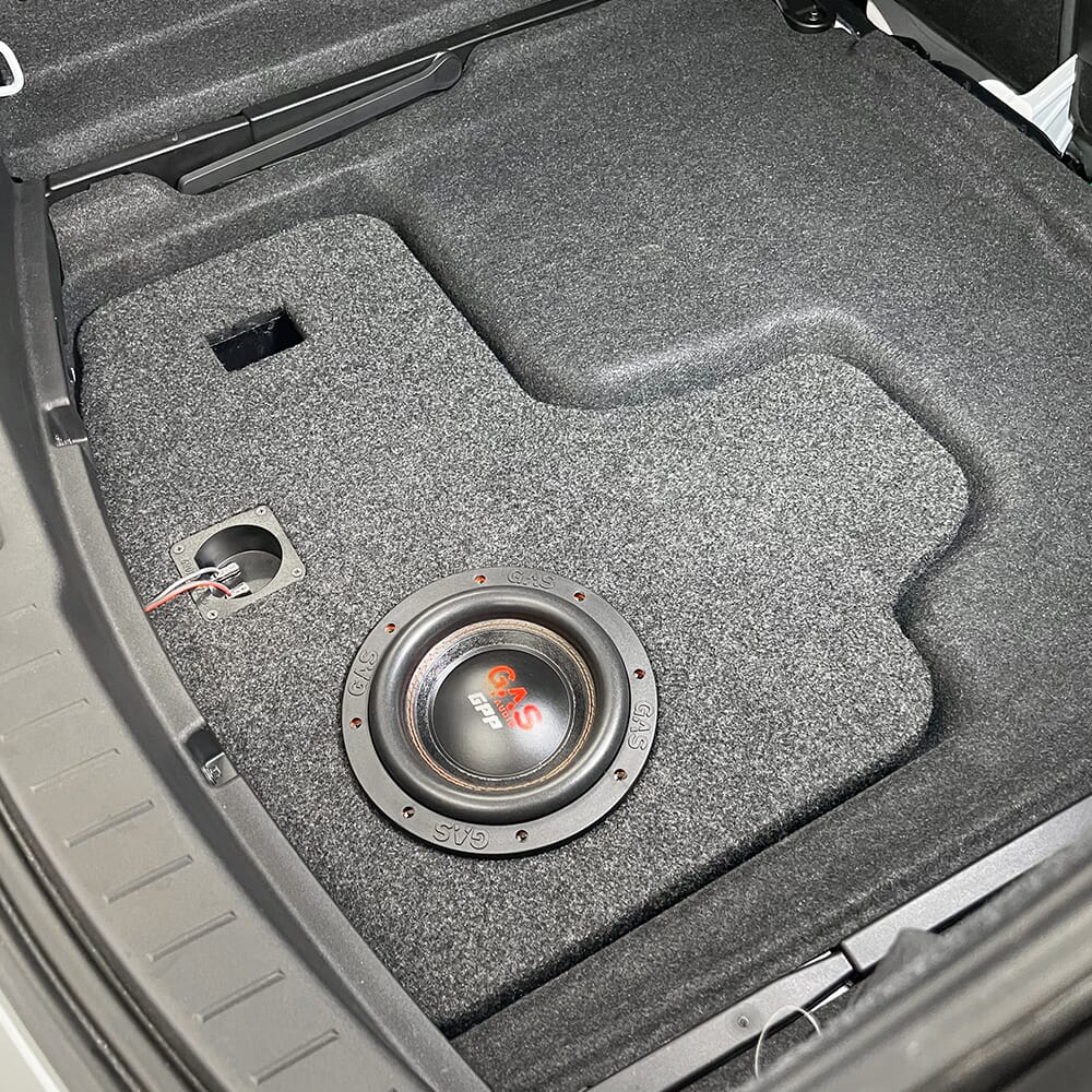 Spesialtilpasset basskasse for montering i bagasjeromsbrønn i Polestar 2. Passer helt perfekt, og helt skjult!