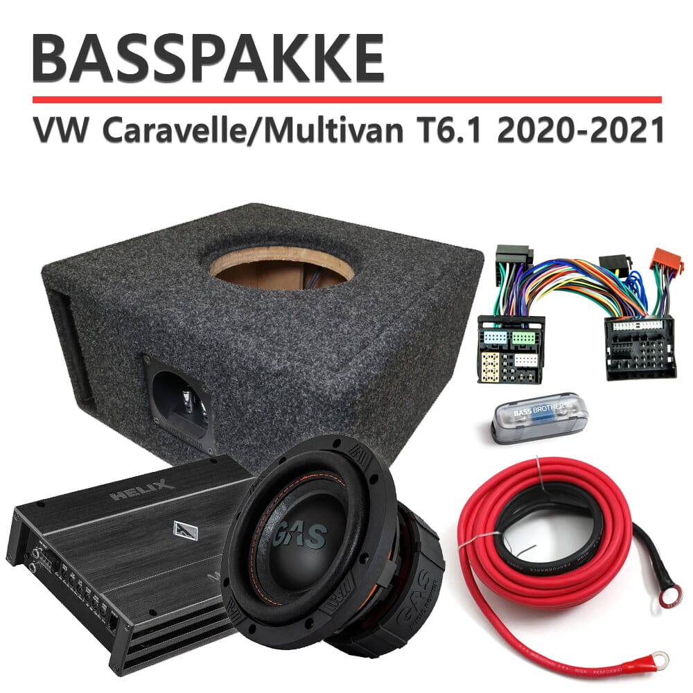 Basspakke spesielt utformet for VW Caravelle og Multivan T6.1. Leveres med plug and play kabelsett. Det eneste som må kobles selv er strømkabel til batteri samt jording.