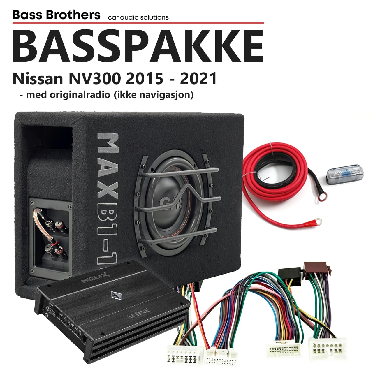 Basspakke tilpasset Nissan NV300. Leveres med Plug&Play kabelsett. Det eneste som må kobles selv er strømkabel til bilens batteri, samt jording. Basskassen passer perfekt under sittebenken på passasjersiden, og forsterkeren er så liten at den også lett plasseres under en av stolene. To bolter som holder rammen til sittebenken må skrues ut for å kunne skyve kassen inn under.