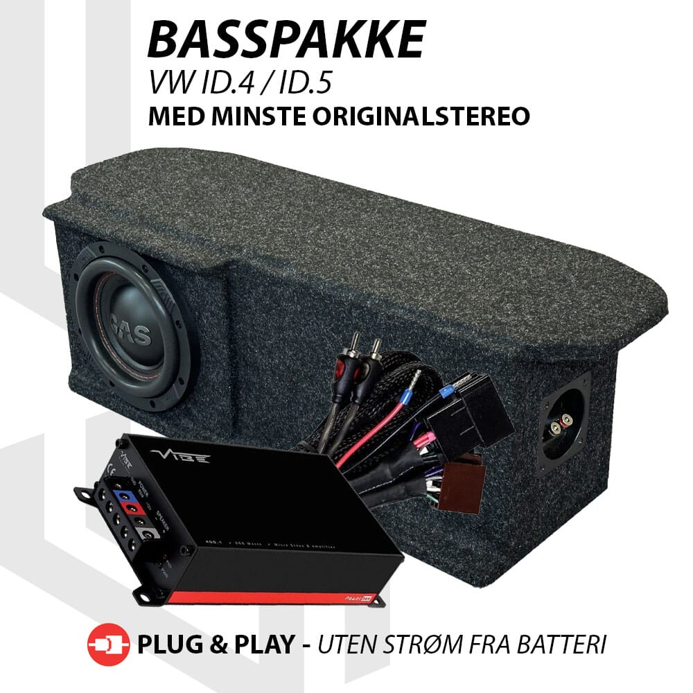 Denne pakken baserer seg på en kompakt basskasse, spesielt utformet for å passe i oppbevaringsrommet under gulvet i bagasjerommet på VW ID.4 og ID.5. 100% skjult og ute av veien for daglig bruk.