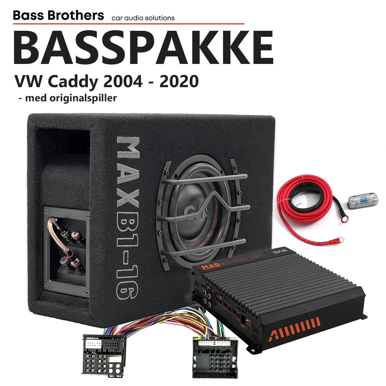 På tide med en solid bassoppgradering i din VW Caddy? Her har du en pakke som gir det lavere registeret et skikkelig løft - og det så det holder. Leveres med plug and play kabelsett. Det eneste som må kobles selv er strømkabel til batteri samt jording. Basskassen plasseres under ene setet, og drives av kvalitetsforsterkeren GAS MAD A2-600.1DFL.