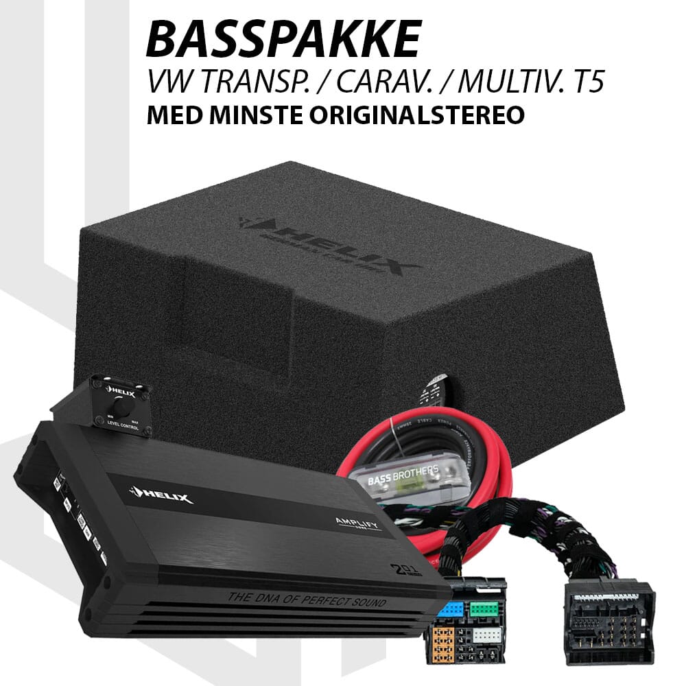 Denne pakken baserer seg på en basskasse som er laget spesifikt for plassering under stoler i 2-seter utgave av VW T5, T6 og T6.1. På norske eksemplarer vil det normalt være under passasjerstol som er aktuell plassering og normalt også gi best lydresultat i førerposisjon. Kontroller likevel din bil at det ikke foreligger større elektroniske komponenter originalt under passasjerstol som gjør monteringen vanskelig å gjennomføre i ditt spesifikke eksemplar.