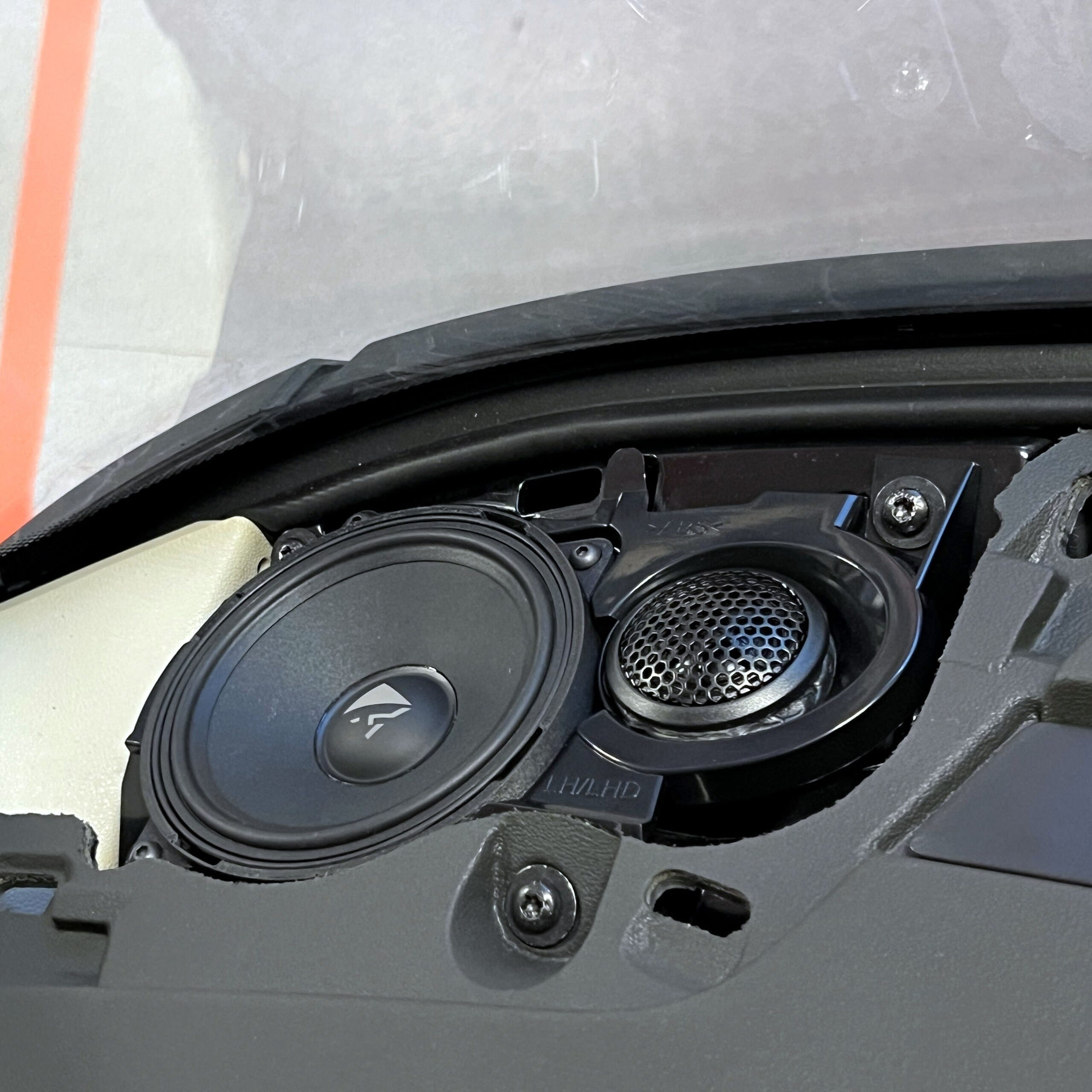Med denne høyttaleroppgraderingen tar vi høyde for problemstillingen ved å montere inn et -6dB filter som tar bort all bass og lavere del av midbass-området i signalet som ledes til de nye 4" høyttalerne fra HELIX Compose. Dette tiltaket rydder kraftig opp i lydbildet siden høyttaleren slipper å jobbe med frekvensområdet den uansett ikke er bygget for. I tillegg eliminerer man alle de unødige vibrasjonslyder fra omgivelser i dashbordet.