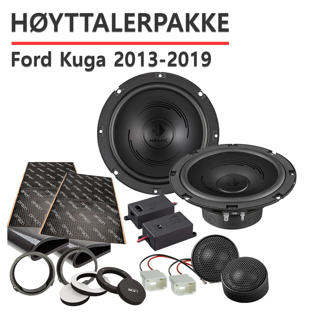 Komplett høyttaleroppgradering for fremdørene i Ford Kuga. Pakken inneholder et helt nytt høyttalersett fra Helix, som gir deg ekte Helix-lyd uten å tømme lommeboka. Settet er også 3 Ohm, som gjør at man får ut mer effekt fra spilleren i bilen - uansett om det er original eller ettermontert.