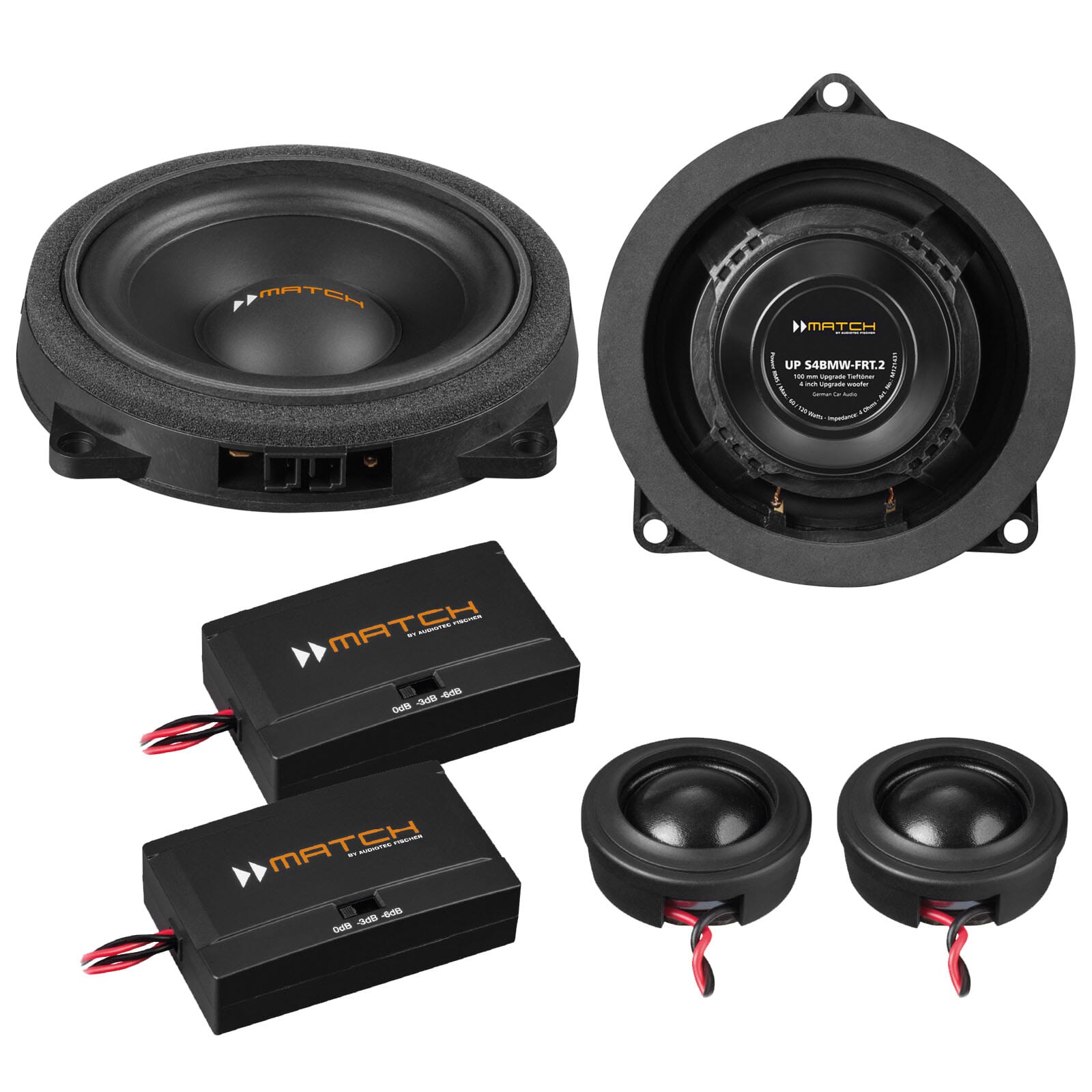 - Fronthøyttalere: Erstatter original mellomtone og ettermontere separat diskant.
