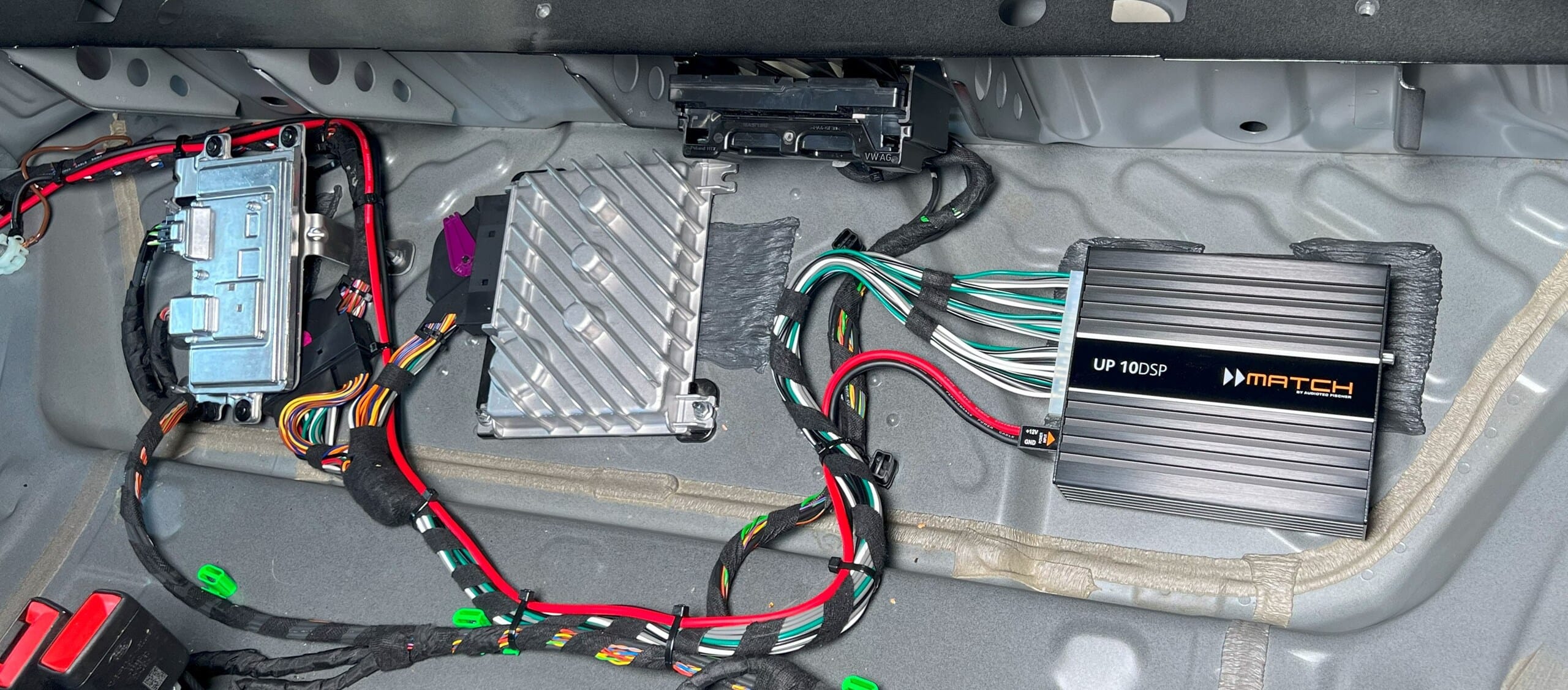 Lokalisert under bakseteputen på Ford Explorer EV finner man bilens originale B&O-forsterker. Tilfeldighetene ville ha det til at bilens originale forsterker benytter en velkjent kontakt med overkommelig antall kanaler i seg, noe som gav muligheten til å forholdsvis enkelt lage et kabelsett ment for en forsterkeroppgradering. Ny Match UP 10DSP innehar nok kanaler til å drive hele bilens originale stereo og dermed et foretrukkent valg til oppgradering som dette. Med strømtilførsel fra batteri er det ellers en ryddig og enkel installasjon av ny forsterker under bakseteputen hvor det finnes enorme mengder ledig plass på Ford Explorer EV.