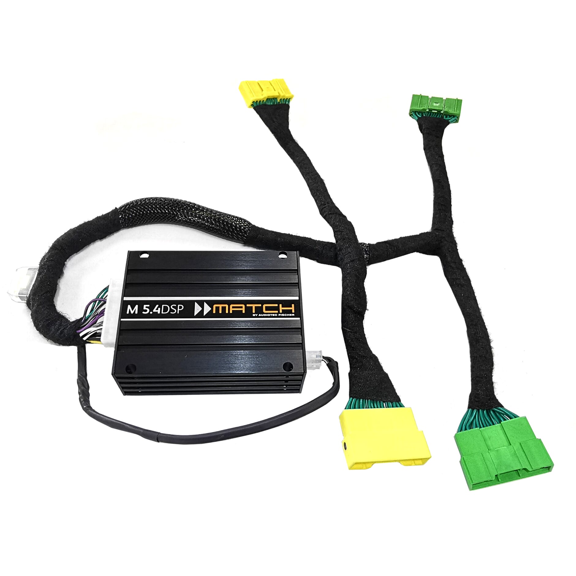 Det som utgjør magien her i denne pakken er en Match M 5.4DSP, en 5-kanals mikroforsterker med 9-kanals lydprosessor (DSP). Forsterkeren kommer ferdig satt opp med lydinnstillinger fra oss, klar til å plugge i bilen. Forsterkerdelen sørger for mer effekt til bilens originale høyttalere, og lydprosessordelen gir riktig oppsett.