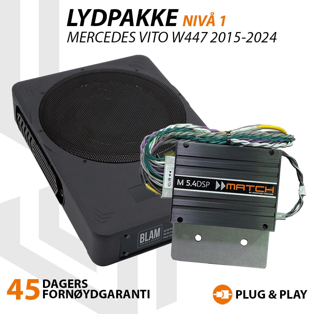 Mercedes Vito W447 viser seg å være bil som virkelig responderer VELDIG godt på vår mest brukte forsterkeroppgradering Match M5.4DSP. I kombinasjon med kompakt basskasse får du her en oppgradering som sikrer deg høyere lyd, penere lyd, fyldigere lyd og det lille ekstra i bassområdet. Og med biltilpasset kabelsett sikrer du ryddig installasjon som er 100% reverserbar uten synlige spor om du i fremtiden vil ta med deg utstyret videre til neste bil.