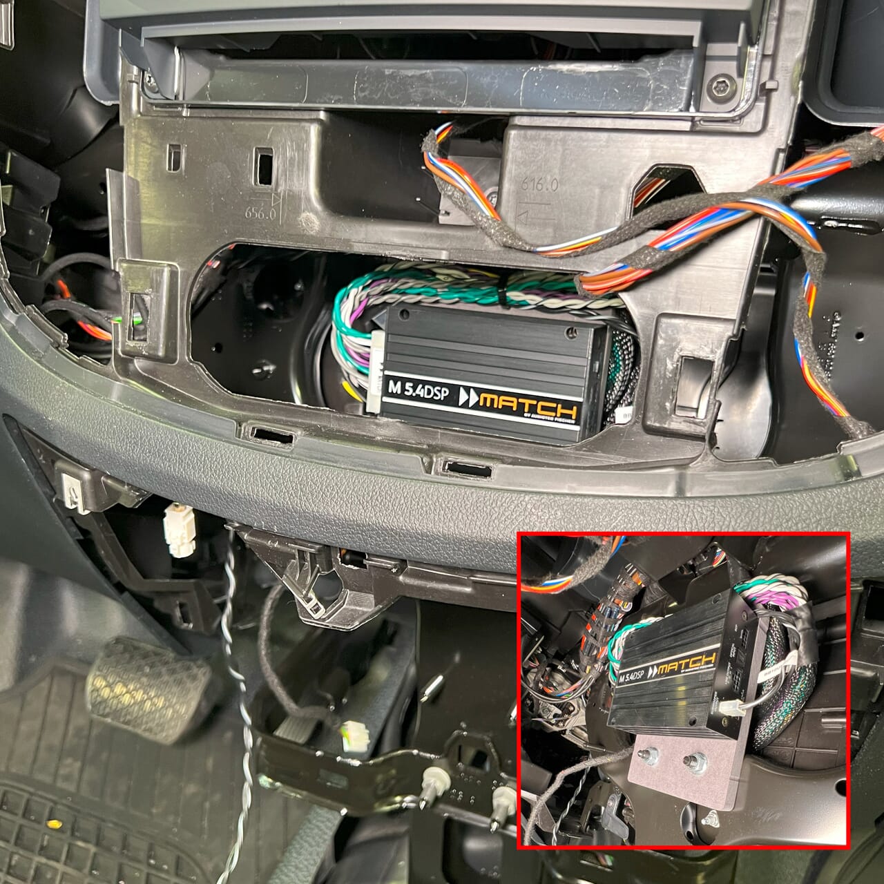 Medfølgende monteringsplate til DSP-forsterker sørger for overlegen monteringsvennlighet ved plassering i dashbordet.