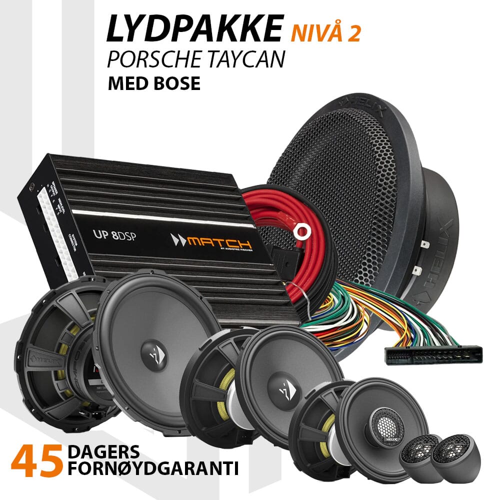 Ønsker du deg økt lydkvalitet i din Porsche Taycan? Denne pakken er spesielt utviklet for Taycan som er utstyrt med BOSE lydsystem. Originalt låter det greit, men det mangler dynamikk, volum og spilleglede. Med en Match UP 8DSP forsterker montert fikk vi kreftene og kontrollen det originale systemet mangler. BOSE systemet er et 14-kanals system, og her har vi valgt å forsterkere åtte av kanalene med Match UP 8DSP. Med denne installert løftes lyden skikkelig i 3-veis systemet foran, i senterkanalen, og i subwooferen bak. Forsterkeren yter godt over 700 ekte watt, og dynamikken og moroa kommer plutselig frem. Selv på lavere volum får man ut mye mer dynamikk og tilstedeværelse av vokal og instrumenter enn hva som er mulig fra originalforsterker.