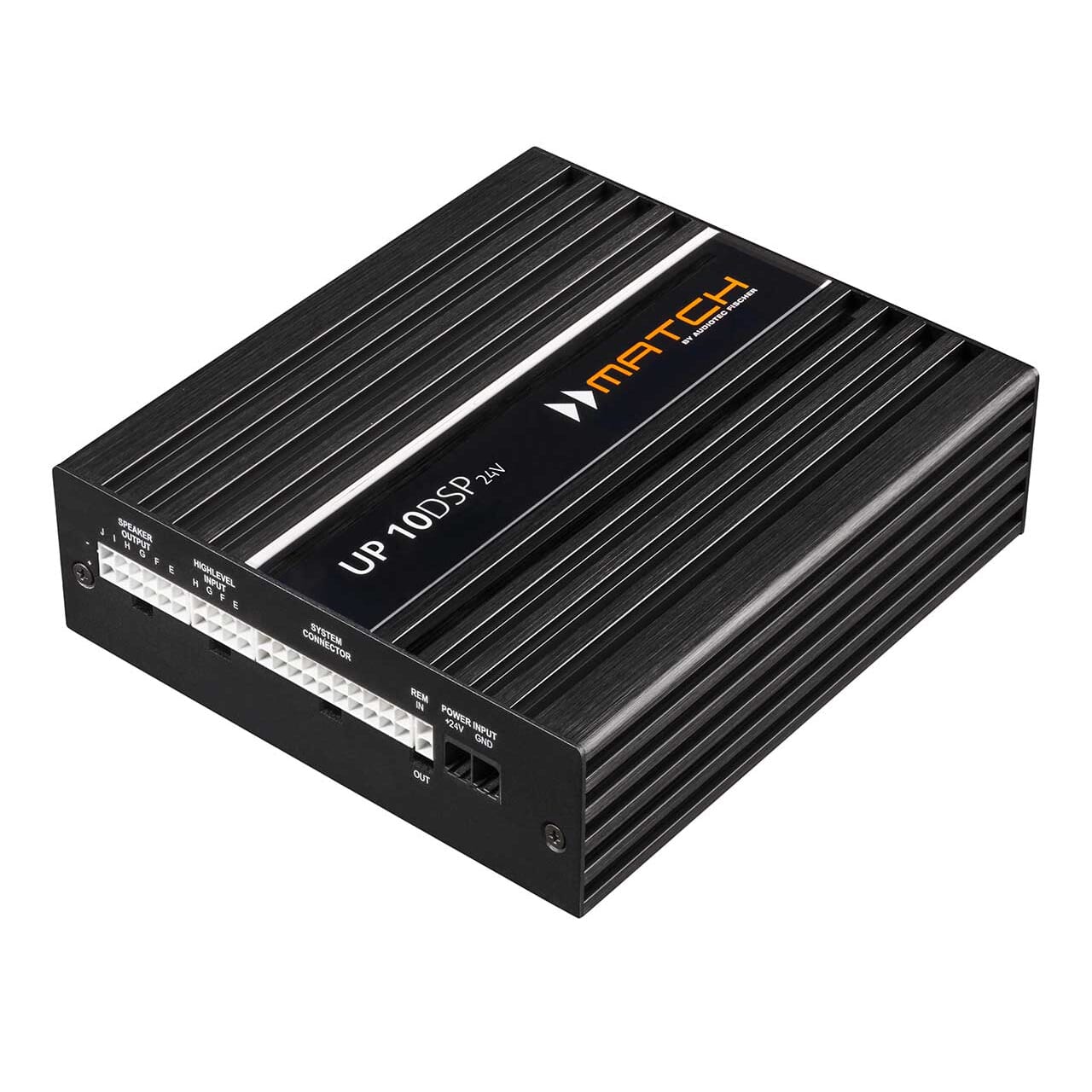 Som hjerte og hjerne i en slik lydoppgradering benytter vi 24V basert DSP-forsterker fra Match, nærmere bestemt UP 10DSP 24V Edition. Forutsetningen om 24V forsterker og ønske om avansert DSP-justering snevrer inn utvalget av produkter. Bonusen er likevel at det naturlige valget faller på en så god DSP-forsterker som nettopp UP 10DSP er. Kraftigere forsterker med flere forsterkerkanaler enn tilsvarende DSP-forsterker benyttet på tidligere Nivå 1 pakker til Scania lastebil gir oss bonuser som bedre ytelse, bedre kontroll på høyttalere og fleksibilitet for videre oppgradering.