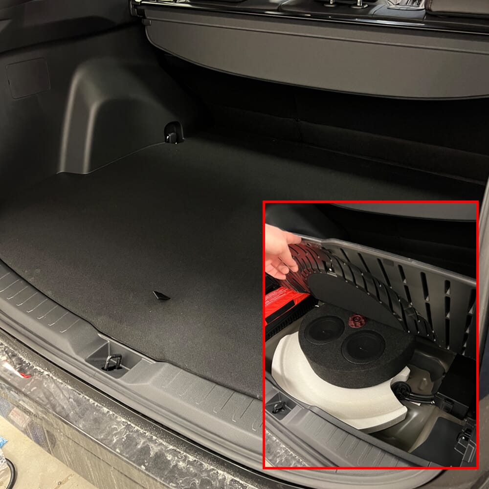Vi har også valgt å benytte en Plug&Play basskasse, som enkelt plasseres i bagasjerommet - og da snakker vi ikke om å "gjøre kål" på hele bagasjerommet, men en elegant løsning som knapt gjør noe utav seg.