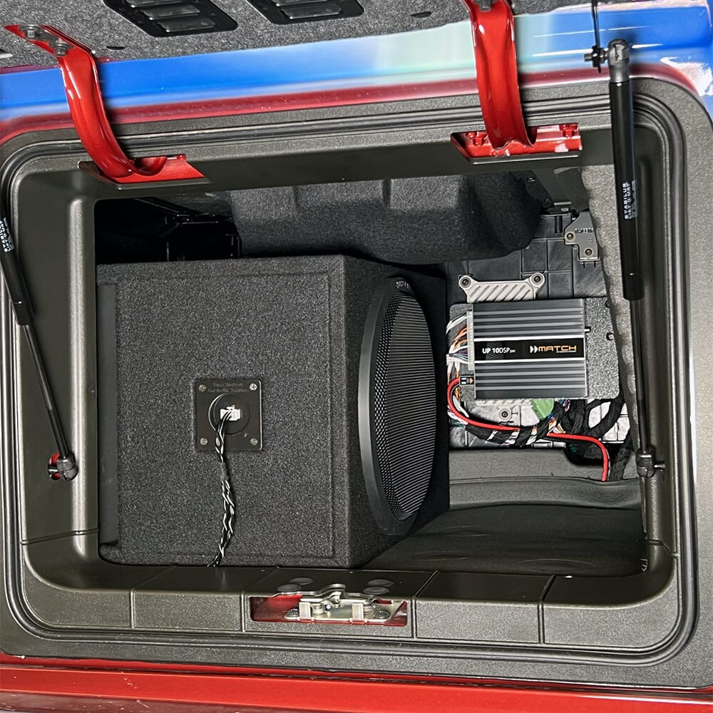 I denne lydoppgraderingen har vi tatt integrasjon av produkter til et nytt nivå. Det medfølger dedikert monteringsplate for Match DSP-forsterkeren, for ryddig og pen installasjon sammen med bilens originale forsterker. Kabelsett mellom ny og original forsterker er unikt og spesielt utviklet av oss for å passe nøyaktig ønsket formål. Den valgte basskassen er levert med kortslutningssikker plug&play-terminal og heldekkende grill / gitter foran basshøyttaler. Noe som skaper en veldig ryddig installasjon i sideluken og lar deg bruke gjenværende plass slik du selv ønsker.