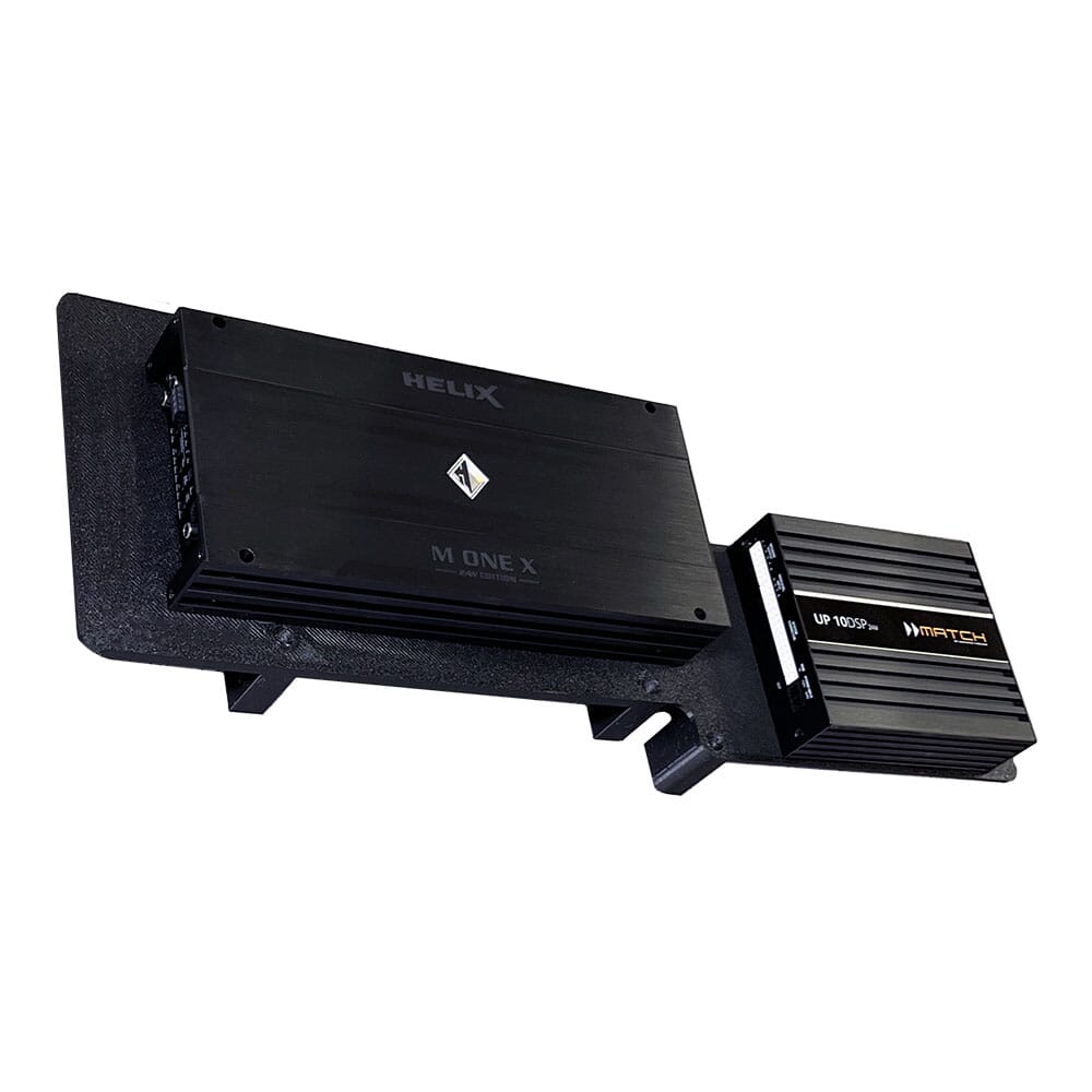 I denne lydoppgraderingen har vi tatt integrasjon av produkter til et nytt nivå. Det medfølger dedikert monteringsplate for Match DSP-forsterkeren og HELIX bassforsterker, for ryddig og pen installasjon sammen med bilens originale forsterker. Kabelsett mellom ny og original forsterker er unikt og spesielt utviklet av oss for å passe nøyaktig ønsket formål. HELIX IQ W10 DVC2 har en lekker, heldekkende grill som beskytter basshøyttaleren optimalt, og lar deg beholde funksjon i ledig oppbevaringsplass i sideluken selv etter at basskassen er montert.