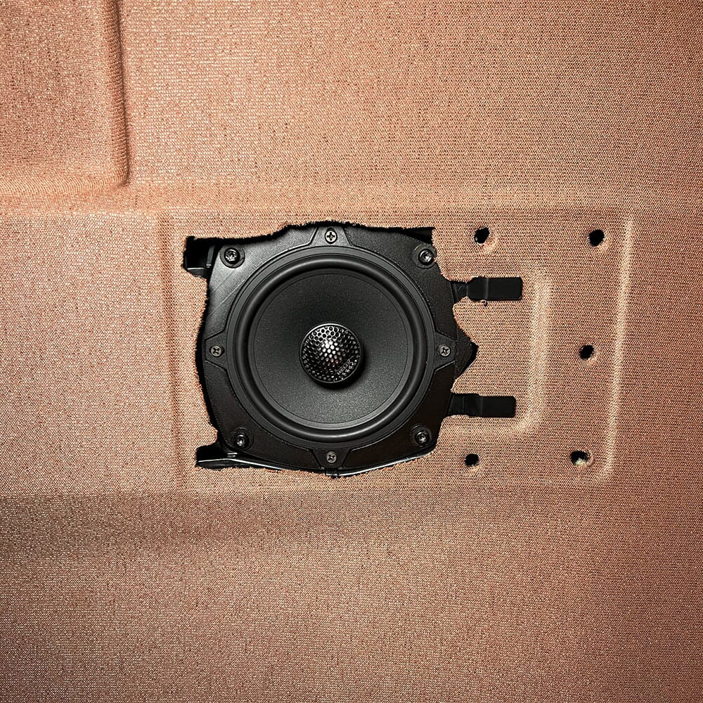 Høyttaleroppgraderingen er gjennomført ned til de minste detaljer. Med 3D-printet høyttaleradapter spesielt tilpasset de ulike høyttalerne og høyttalerplasseringer, samt overganger til originale kontakter til høyttalere på dashbord.