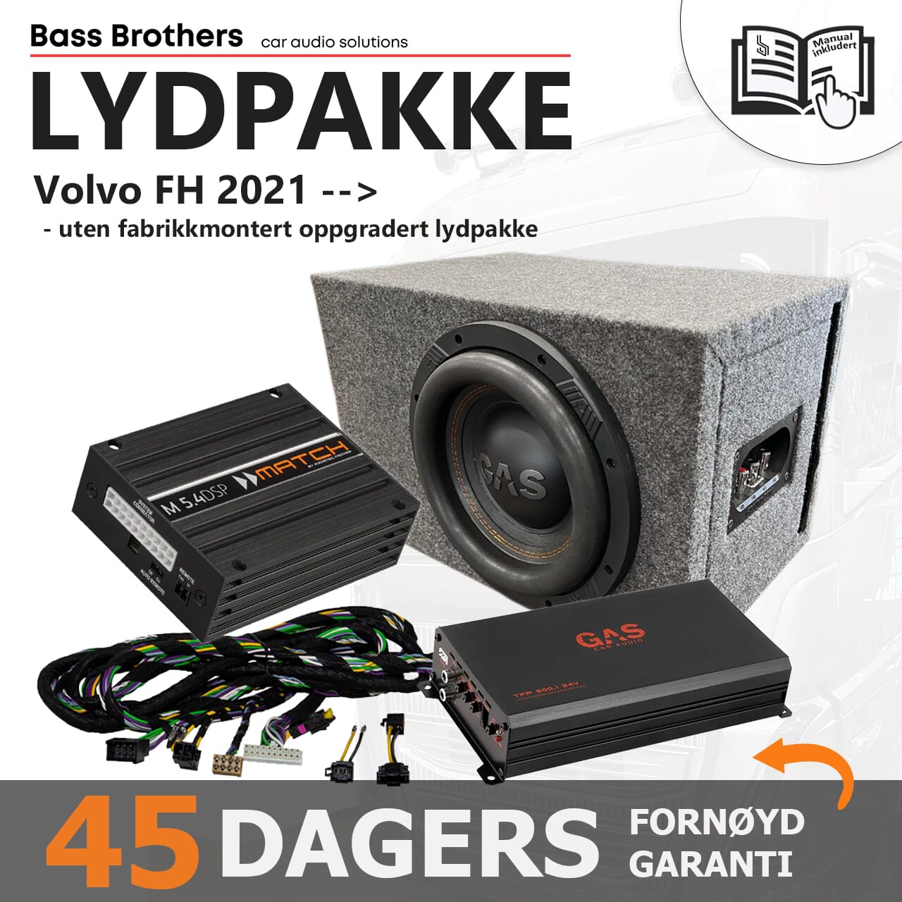 Vi har tatt utgangspunkt i den standard Match-pakken for Volvo FH, men tatt det et grovt hakk opp spesielt på den dypere enden av frekvensskalaen. Her har vi lagt til en GAS 10" subwoofer fra den utrolig populære MAX-serien, kombinert med en dedikert basskasse. Denne saken gir skikkelig feit, god og dyp bass, og som de andre subwooferelementene i denne serien er den også veldig musikalsk. På grunn av den vesentlig grovere bassen trengs det også mer effekt, og derfor finner du i pakken en 24 volt monoblokk fra GAS som yter hele 500W RMS. Den frigjør også Match-forsterkeren fra bass-oppgaven, som igjen gir mer effekt til høyttalerne.