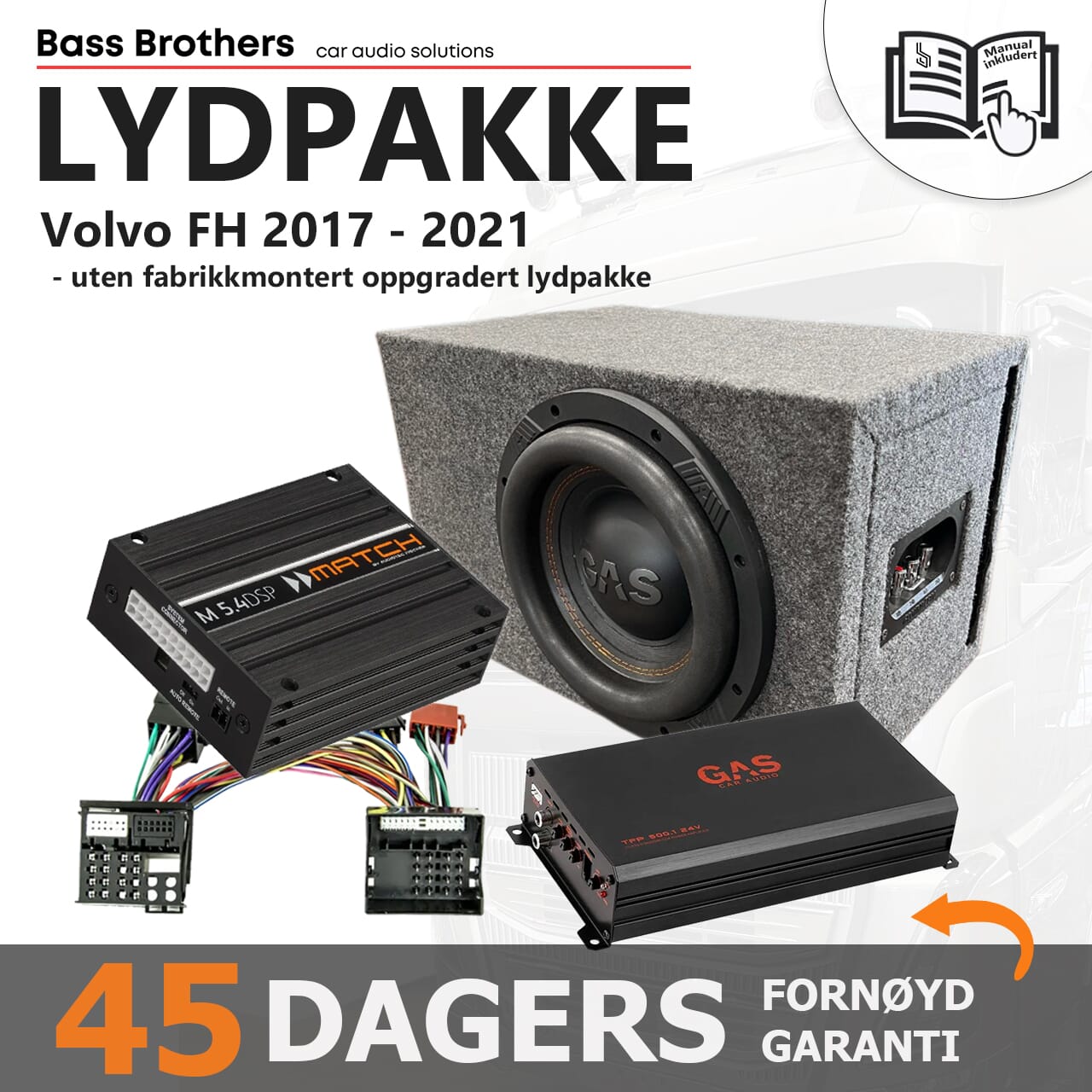 Vi har tatt utgangspunkt i den standard Match-pakken for Volvo FH, men tatt det et grovt hakk opp spesielt på den dypere enden av frekvensskalaen. Her har vi lagt til en GAS 10" subwoofer fra den utrolig populære MAX-serien, kombinert med en dedikert basskasse. Denne saken gir skikkelig feit, god og dyp bass, og som de andre subwooferelementene i denne serien er den også veldig musikalsk. På grunn av den vesentlig grovere bassen trengs det også mer effekt, og derfor finner du i pakken en 24 volt monoblokk fra GAS som yter hele 500W RMS. Den frigjør også Match-forsterkeren fra bass-oppgaven, som igjen gir mer effekt til høyttalerne.