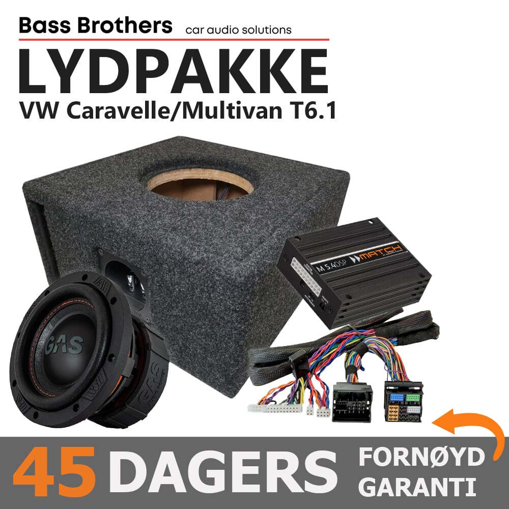 Komplett spesialtilpasset oppgraderingsløsning for VW Caravelle og Multivan T6.1. Leveres med plug and play kabelsett. Det eneste som må kobles selv er strømkabel til batteri samt jording.