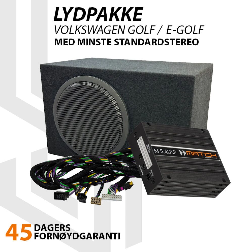 Match oppgraderingspakke, for deg som ønsker mer og bedre lyd i din Golf mk7 eller e-Golf uten å gjøre noen inngrep i bilen, men også ønsker kraftigere bass enn de mer kompakte basskassene gir. Alt direkte tilkoblet på originalspilleren.