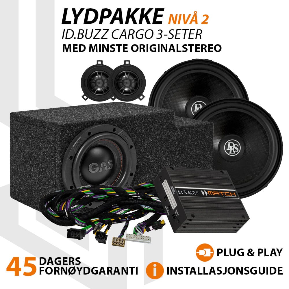 Dette er pakken for deg som ønsker størst mulig lydoppgradering med minst mulig innsats! ID.Buzz viser seg å være bil som virkelig responderer godt på vår mest brukte forsterkeroppgradering Match M5.4DSP. I kombinasjon med biltilpasset basskasse får du her en oppgradering som sikrer deg høyere lyd, penere lyd, fyldigere lyd og et bassfundament som slett ikke fantes fra før av. Og med biltilpasset kabelsett sikrer du ryddig installasjon som er 100% reverserbar uten synlige spor om du i fremtiden vil ta med deg utstyret videre til neste bil.