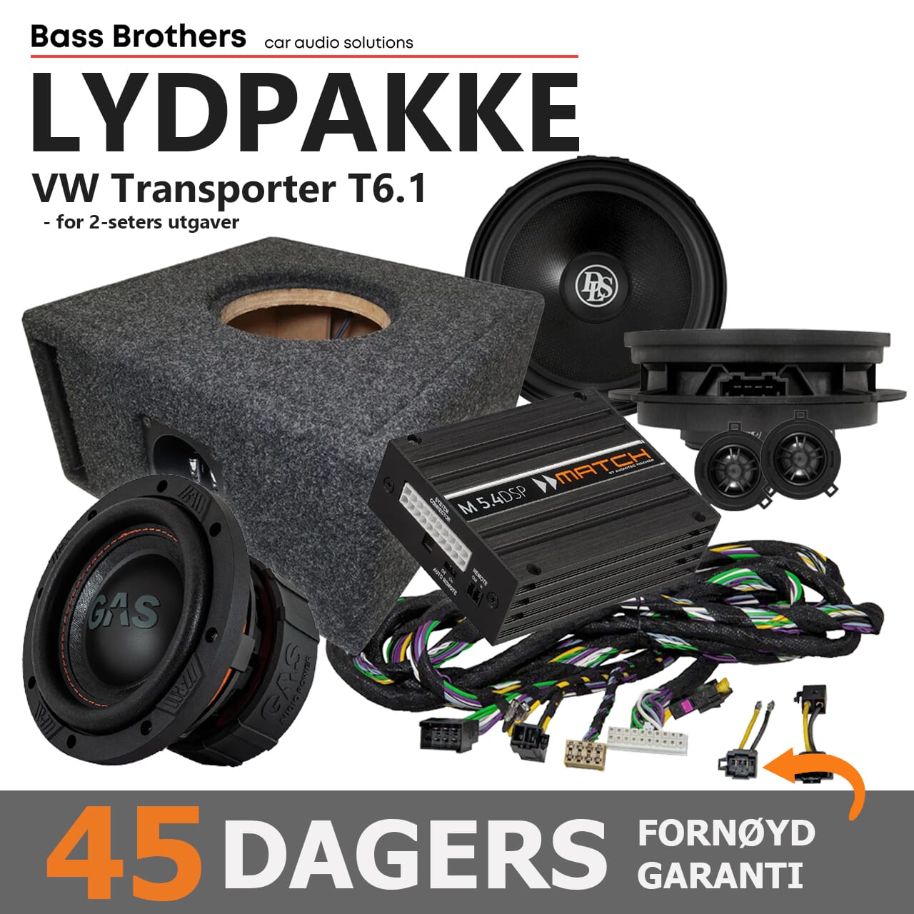 Komplett plug and play lydpakke spesielt utformet for VW Transporter T6.1 2-seters utgave, med originalradio. Leveres med plug and play kabelsett. Kassen plasseres under passasjersetet, og høyttalere er spesialdesignet for VW T6.1. Forsterker driver både bass og høyttalere.