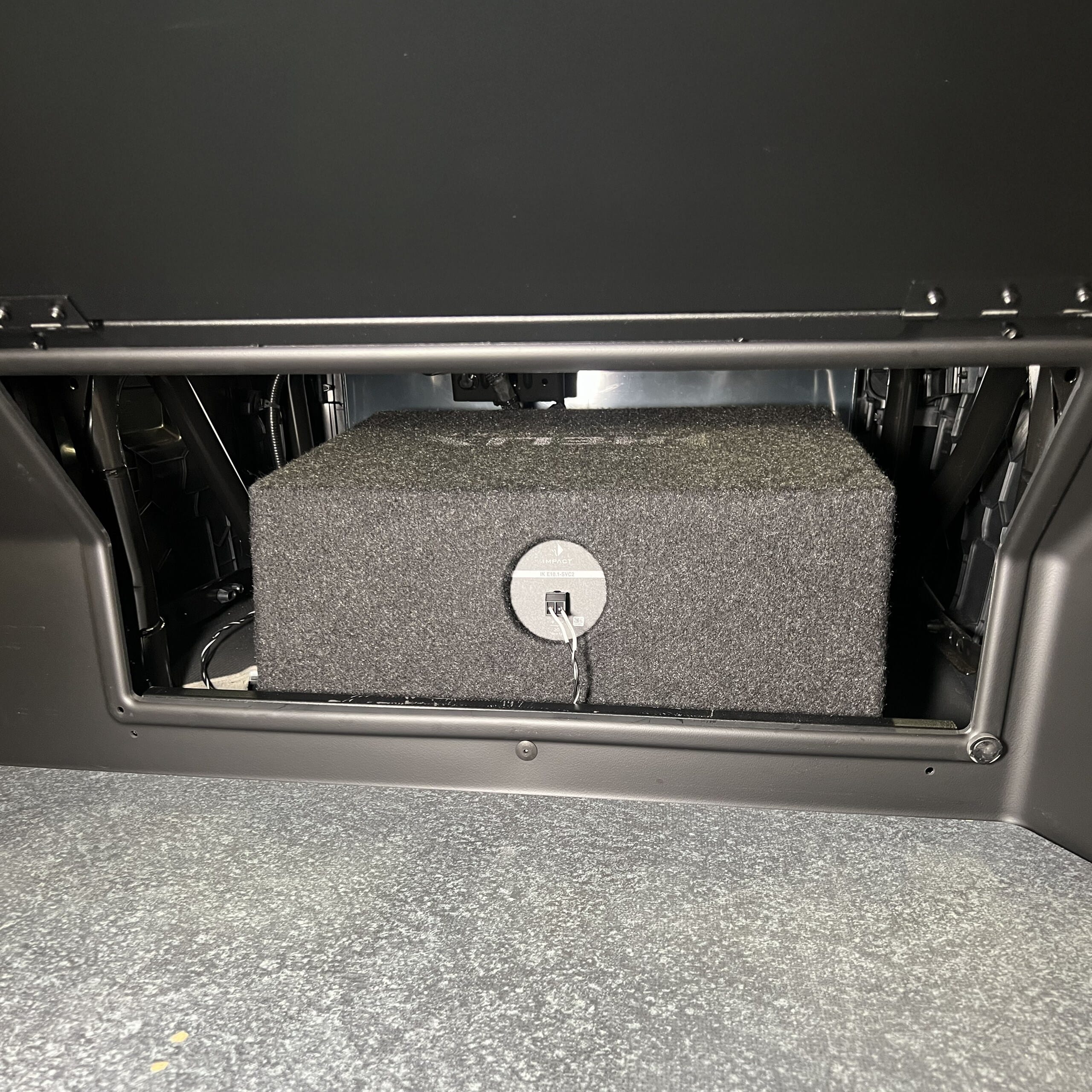 I sittebenken på passasjersiden i Transporter T7 er der rikelig med plass til å skjule en god basskasse. Det gjør at man kan ta bassmengde til et nytt nivå. Etter testing av mange ulike typer basskasser, lukket og portet i alle rare dimensjoner, så var det helt klart HELIX IK E10.1 som trakk det lengste strået. Her snakker vi en nydelig kombinasjon av dyp, fyldig og varm bass med sterkt fokus på musikalsk korrekt, ryddig og leken bass. En basskasse som veldig lett tilfredsstiller enhver lytter uavhengig av musikksmak.