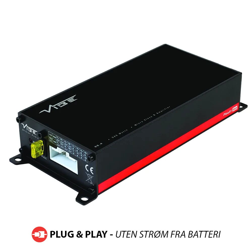 Her får man altså koblet til VIBE Powerbox forsterker som henter signal og strøm i ett og samme biltilpassede kabelsett. I det samme kabelsettet går det også ut forsterket retursignal på bilens originale ledningsnett. Forsterkeren vil slå seg av og på med spillerens signaler på høyttalerkablene. Enklere blir det ikke!