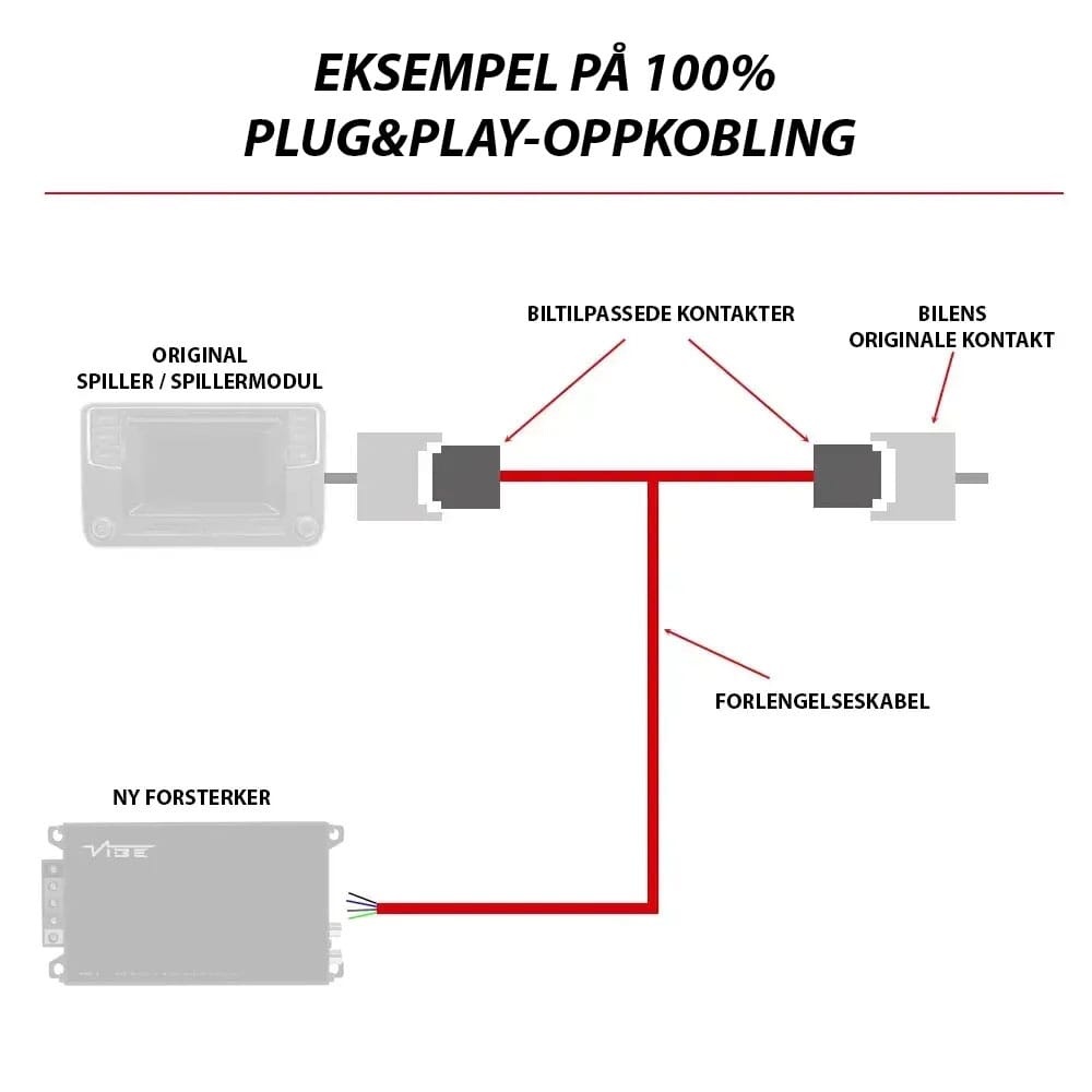 - Forsterker: Lokaliser bilens originale spiller / spillermodul (i bakkant av speedometer). Koble i mellom plug&play-kabelsett. Plasser ny forsterker på ønsket lokasjon og koble til kabelsett.